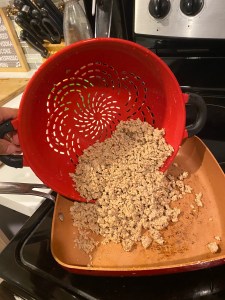 Optional: I strain and press the ground Turkey to remove excess fat, this step is not necessary but I prefer it.